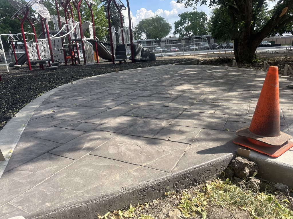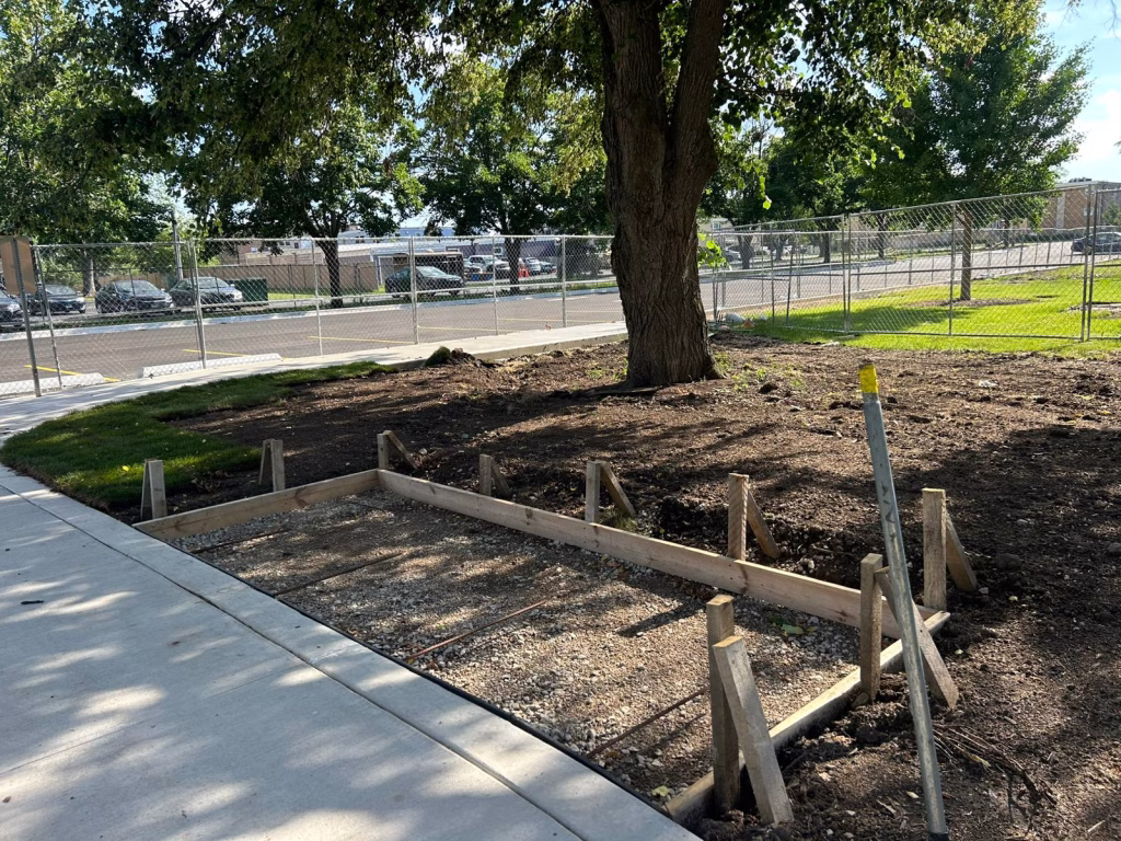 New concrete curbing has been installed around the perimeter of the future playground area. This curbing helps define the layout and will provide a border for the safety surfacing to come.