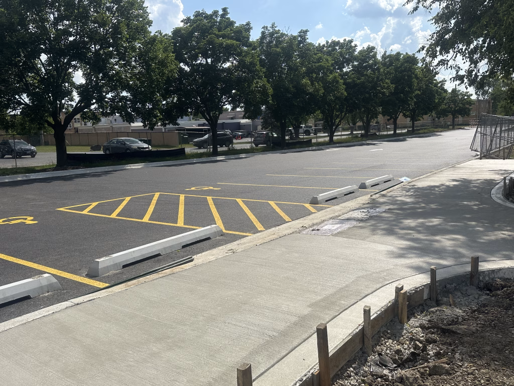 The newly paved parking lot is now complete and open to the public with fresh striping and accessible parking clearly marked. Crews are currently focused on finishing concrete work for the ADA-accessible walkways and installing new seatwalls near the playground. Landscaping work is also underway to complete the surrounding areas and enhance the park’s appearance.