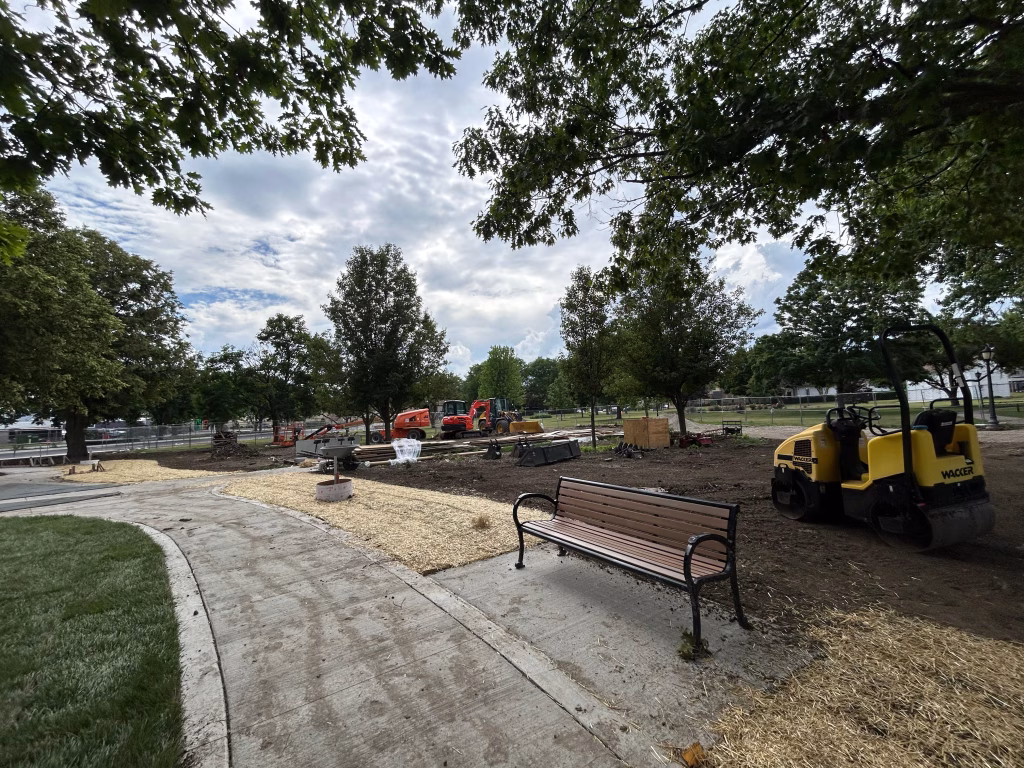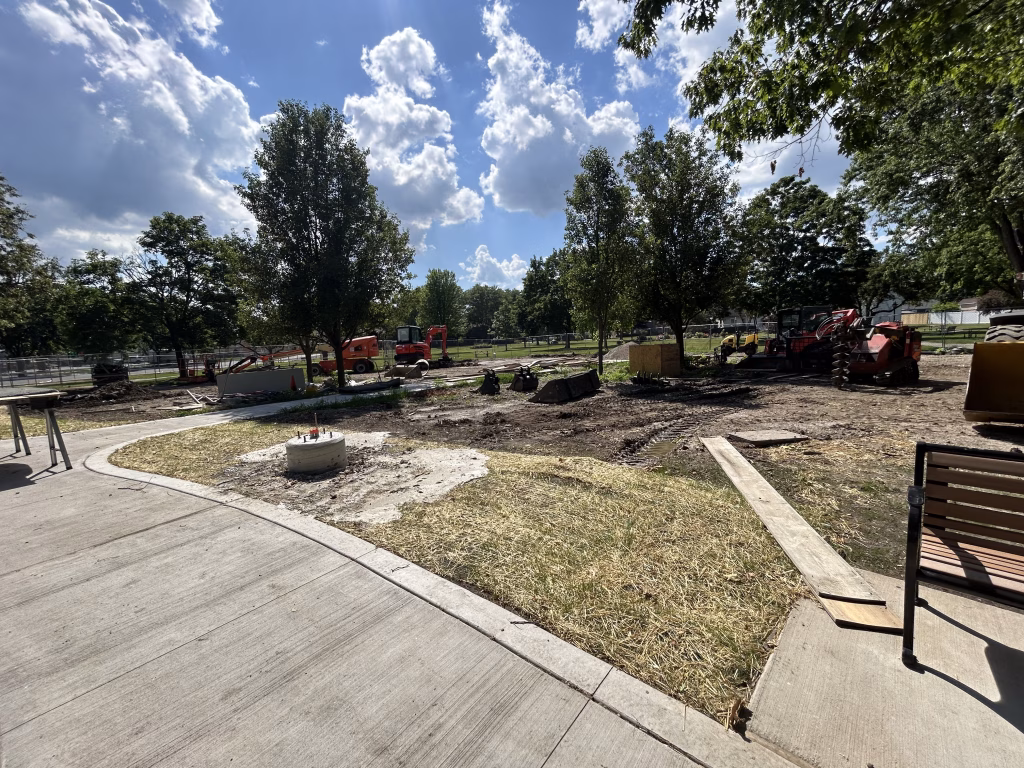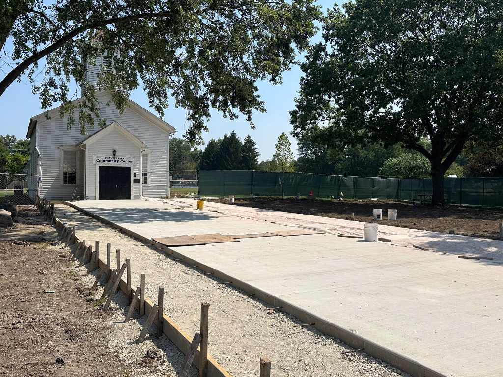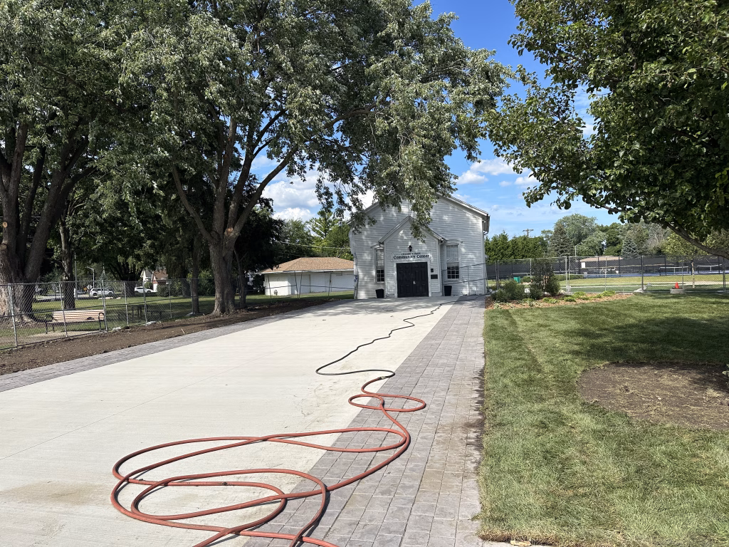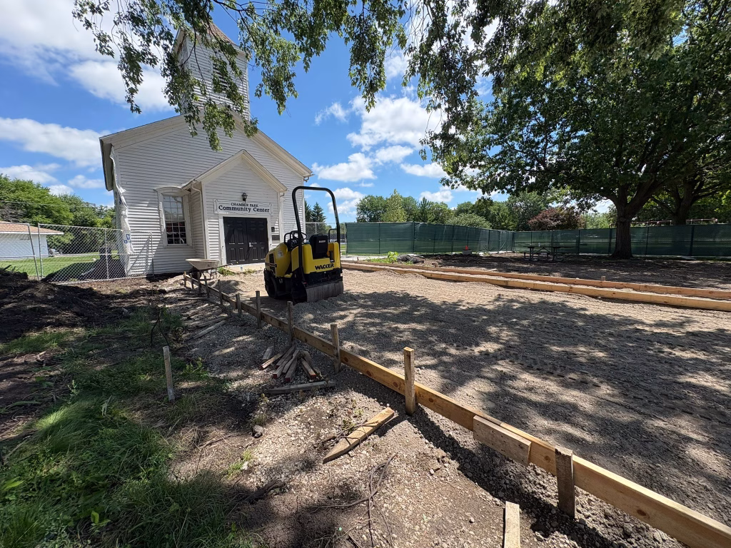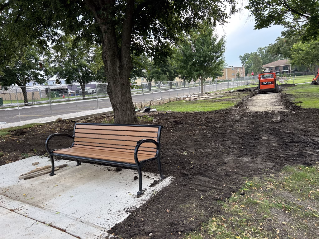 Martam Construction has completed all underground stormwater piping, marking a major step forward in site infrastructure. Park District crews finished installing curbs and have begun work on walkways around the historic church. New concrete paths now connect key areas of the park, with additional walkway work underway. Weather permitting, asphalt path paving will begin in the coming days.