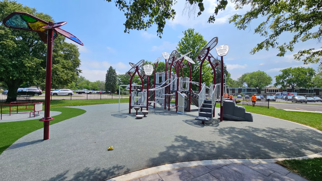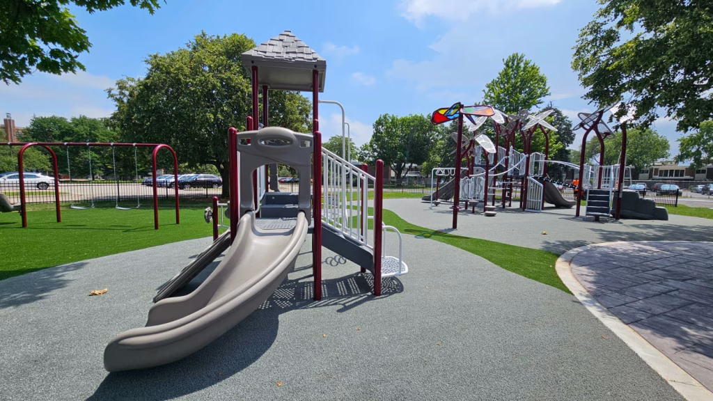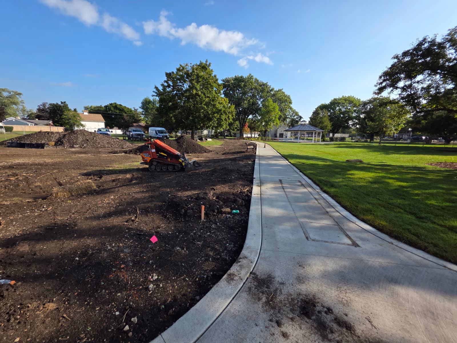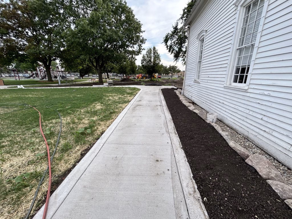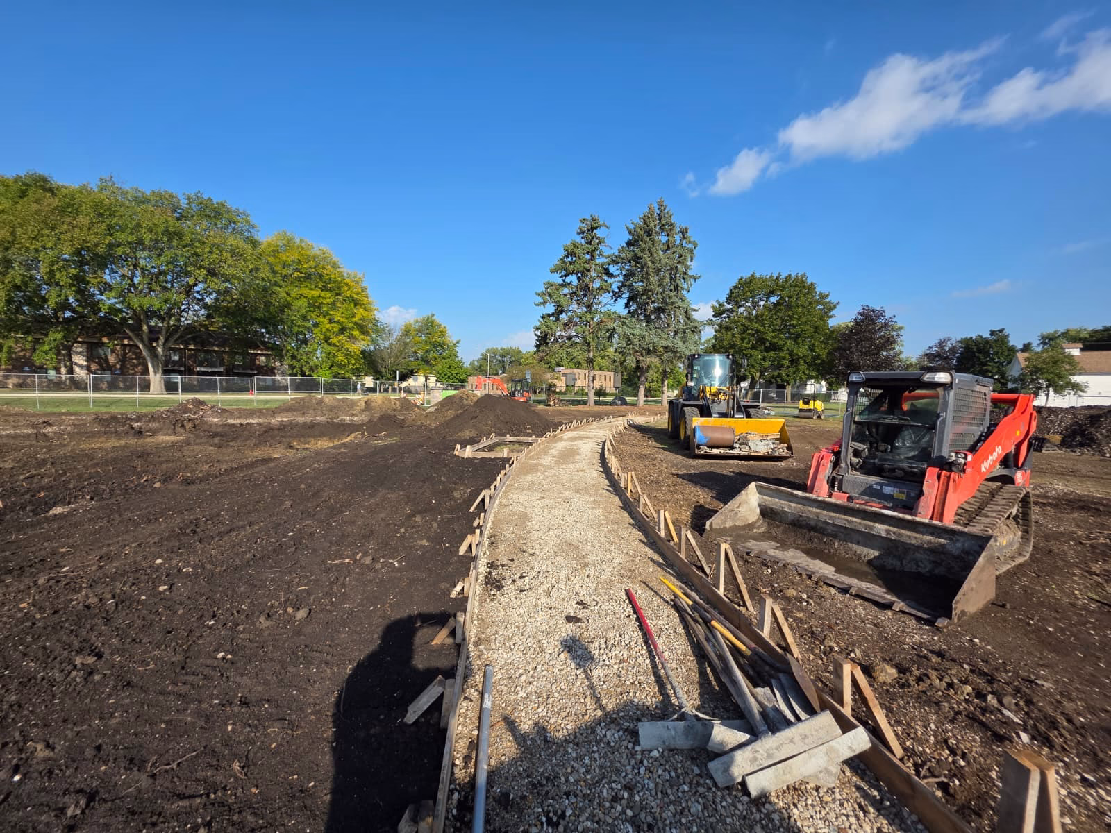 Martam Construction has completed all underground stormwater piping, marking a major step forward in site infrastructure. Park District crews finished installing curbs and have begun work on walkways around the historic church. New concrete paths now connect key areas of the park, with additional walkway work underway. Weather permitting, asphalt path paving will begin in the coming days.