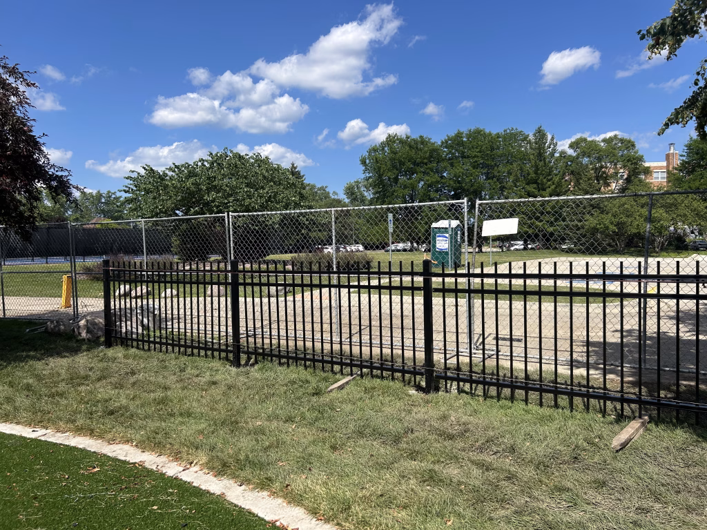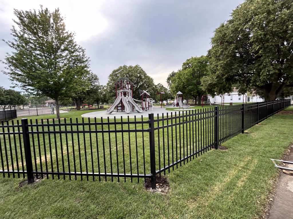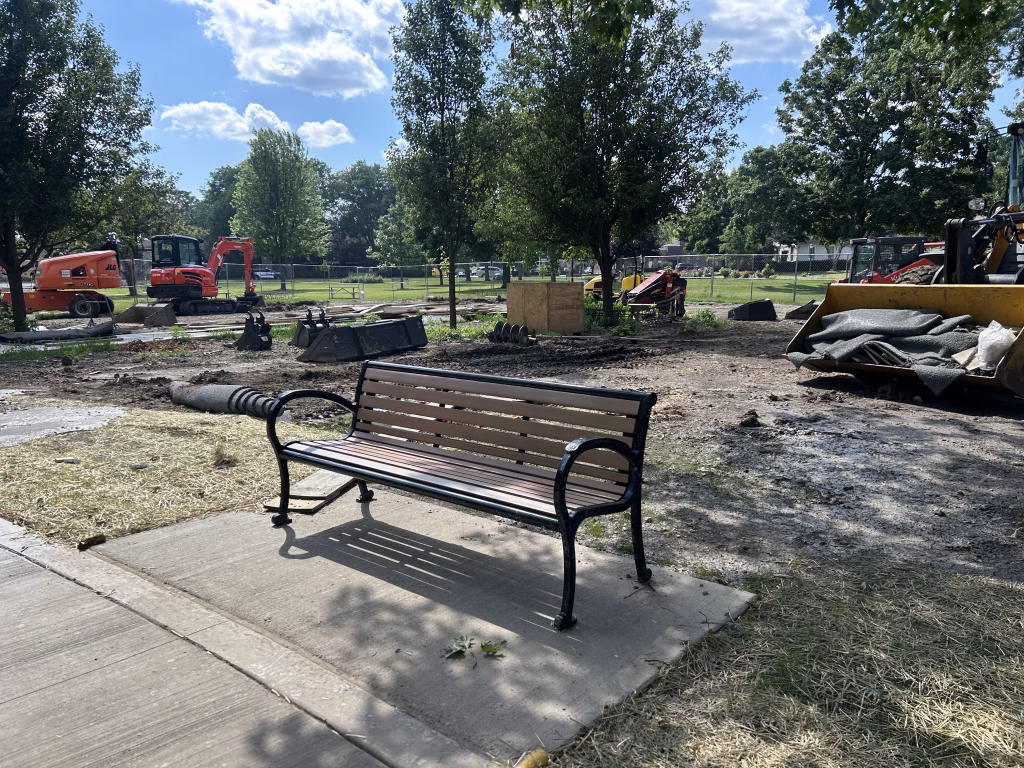 Final site features are coming into place. The new drinking fountain and benches have been installed, and freshly poured concrete pads now anchor key areas throughout the park. Fencing installation has begun around the playground area, adding a layer of safety and definition to the space. Crews continue with landscaping touch-ups and utility work.