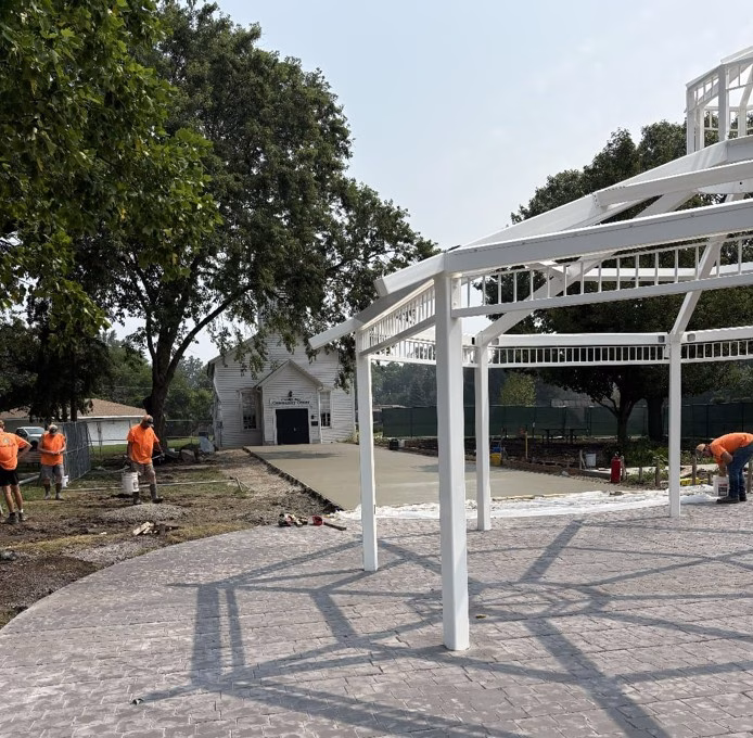Construction at Chamber Park is progressing steadily, with the gazebo structure now fully framed and set atop a newly poured and finished concrete pad. Most of the concrete walking paths around the park have been poured, with remaining sections formed and ready for completion. Crews are shifting focus toward roofing installation on the gazebo and final grading and landscaping across the site.