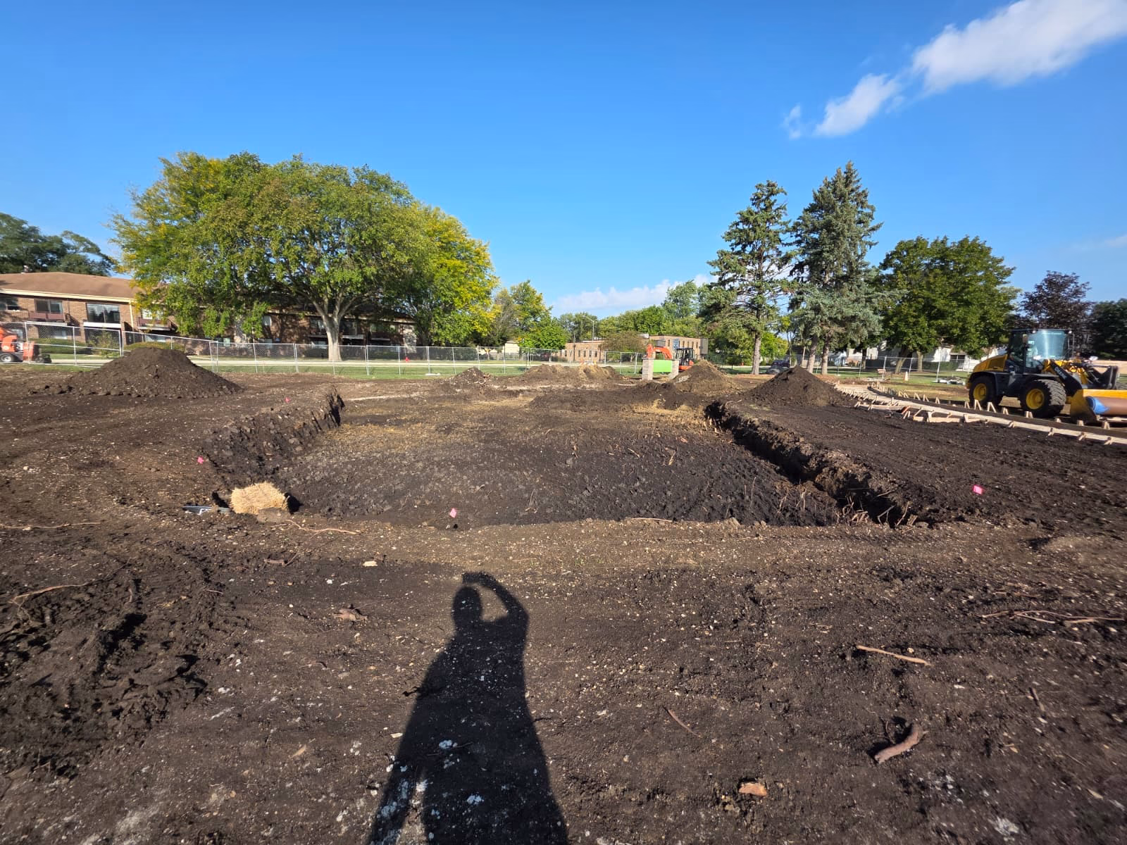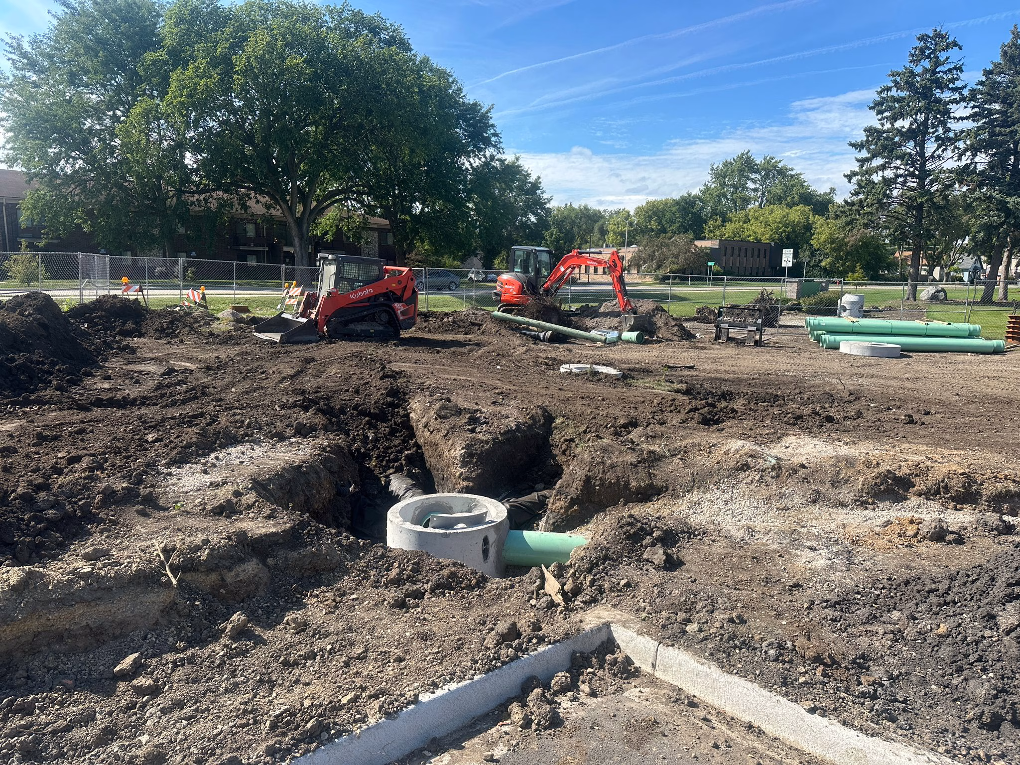 Crews have been busy framing additional concrete walkways that will connect key areas of the park and improve accessibility. Underground drainage systems have also been installed, an important step in managing stormwater and ensuring the park remains functional during heavy rains. In addition, excavation work advanced on the stormwater basins, which will further enhance the site’s long-term sustainability. With these critical infrastructure pieces underway, the park is moving closer to its finished form.