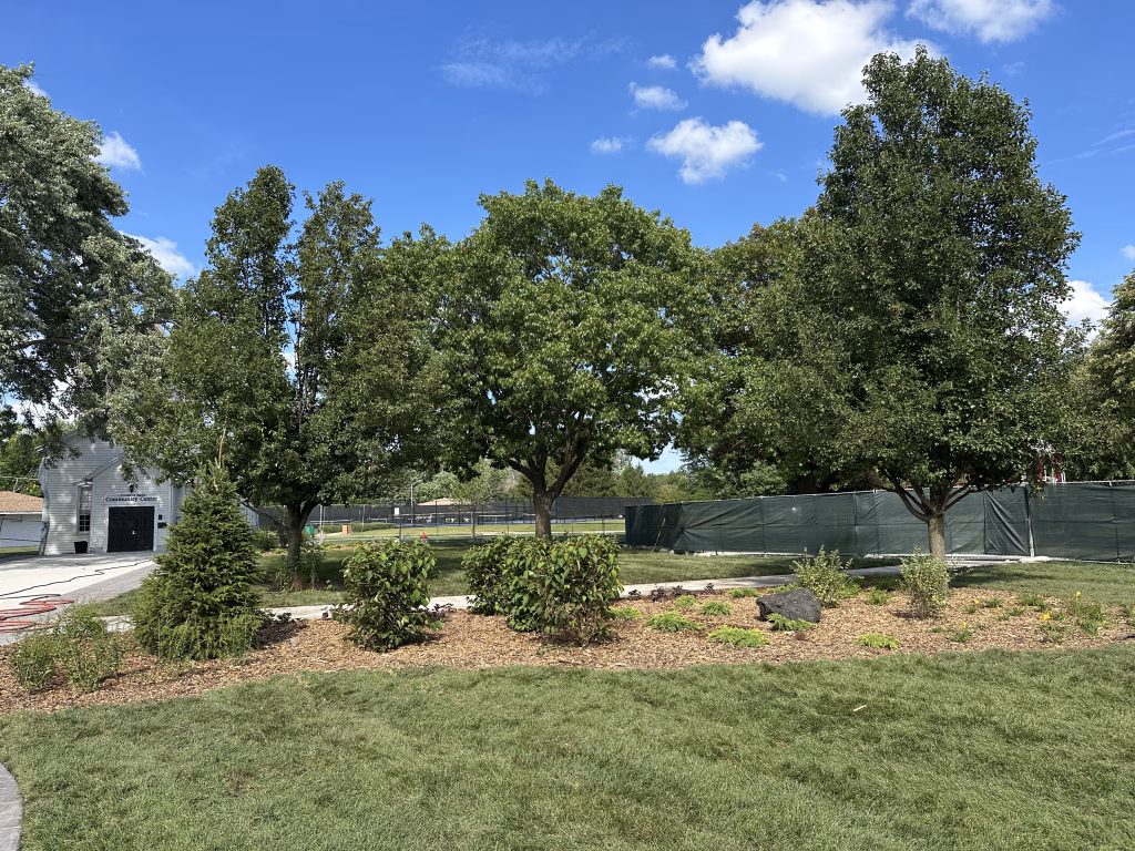 The new gazebo has been fully installed and sits beautifully on a completed circular paver plaza. Fresh sod has been laid throughout the lawn areas, with irrigation and establishment now underway. Landscape beds have been mulched and planted with a mix of shrubs, perennials, and evergreens, adding both structure and seasonal color along the walkways.