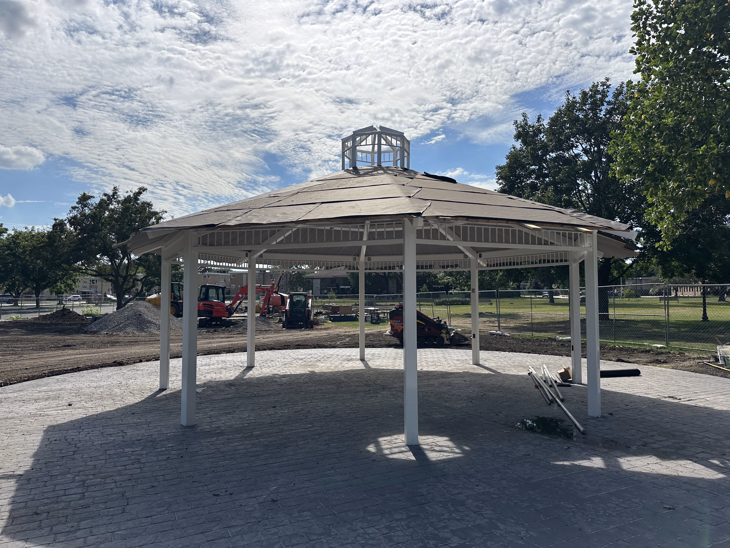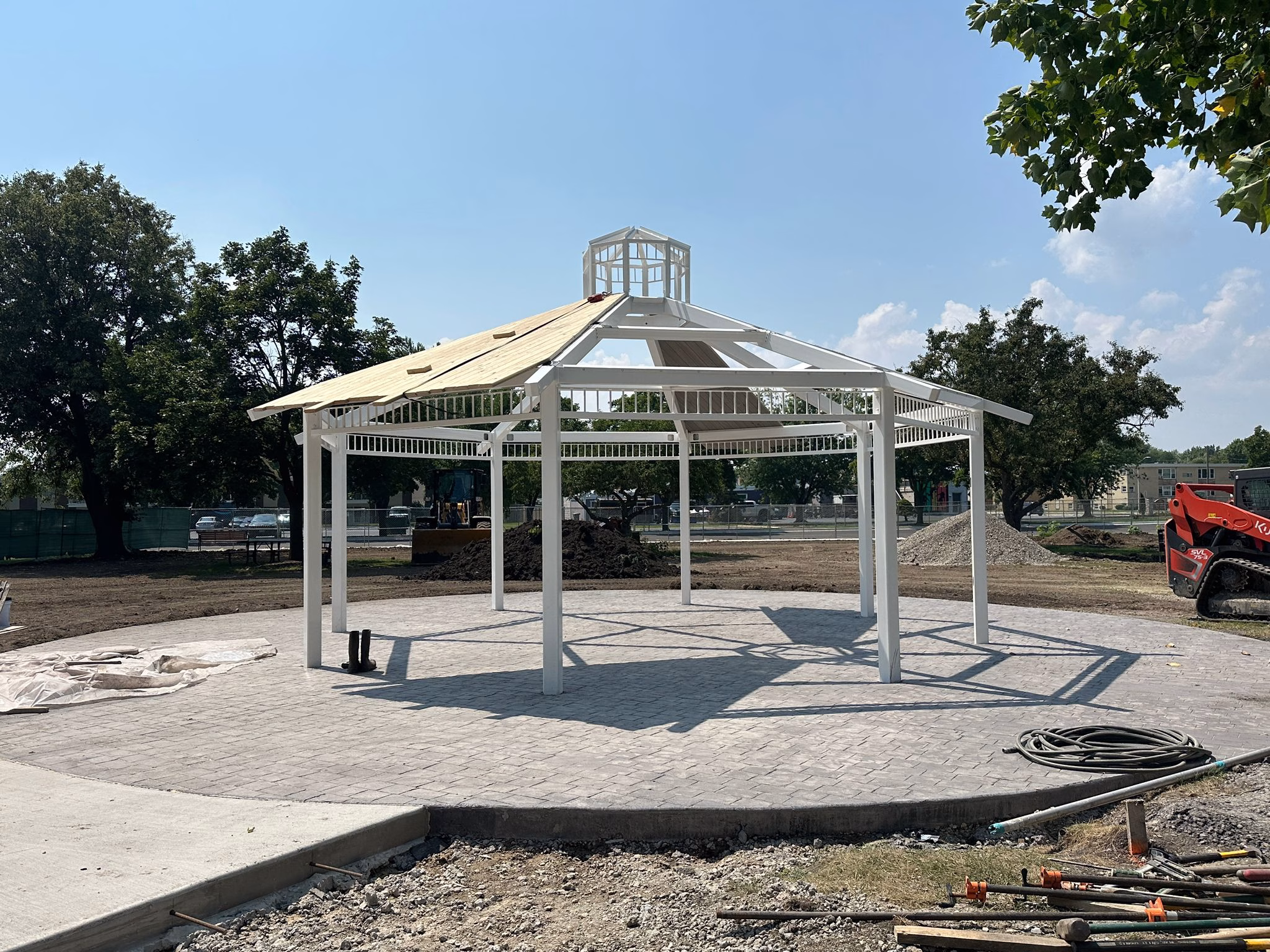 Roof panel installation continues on the gazebo, bringing it closer to completion. Landscaping work is progressing with fresh plantings and mulch around the structure. Concrete paths are taking shape, connecting the gazebo to the surrounding park space.