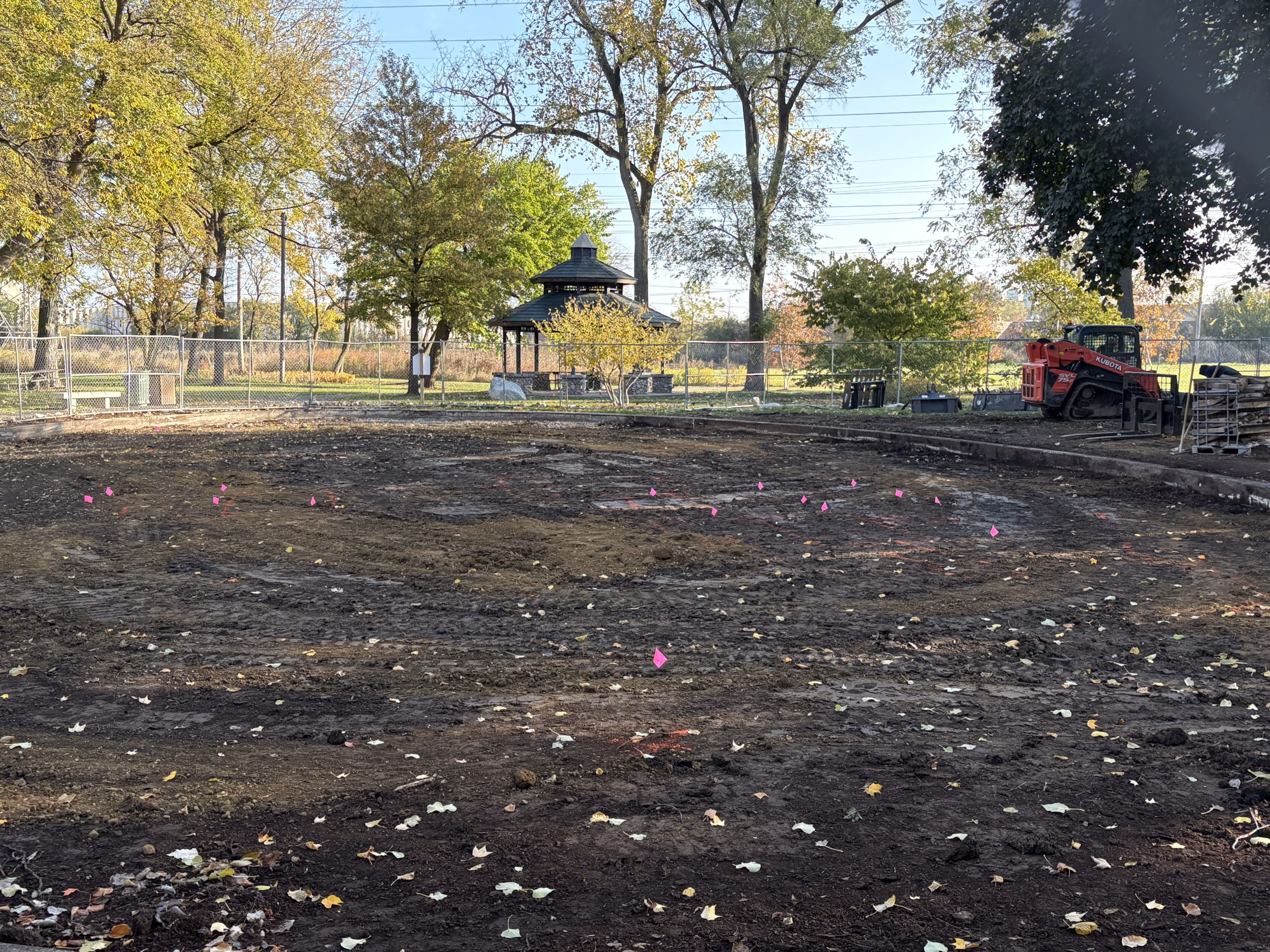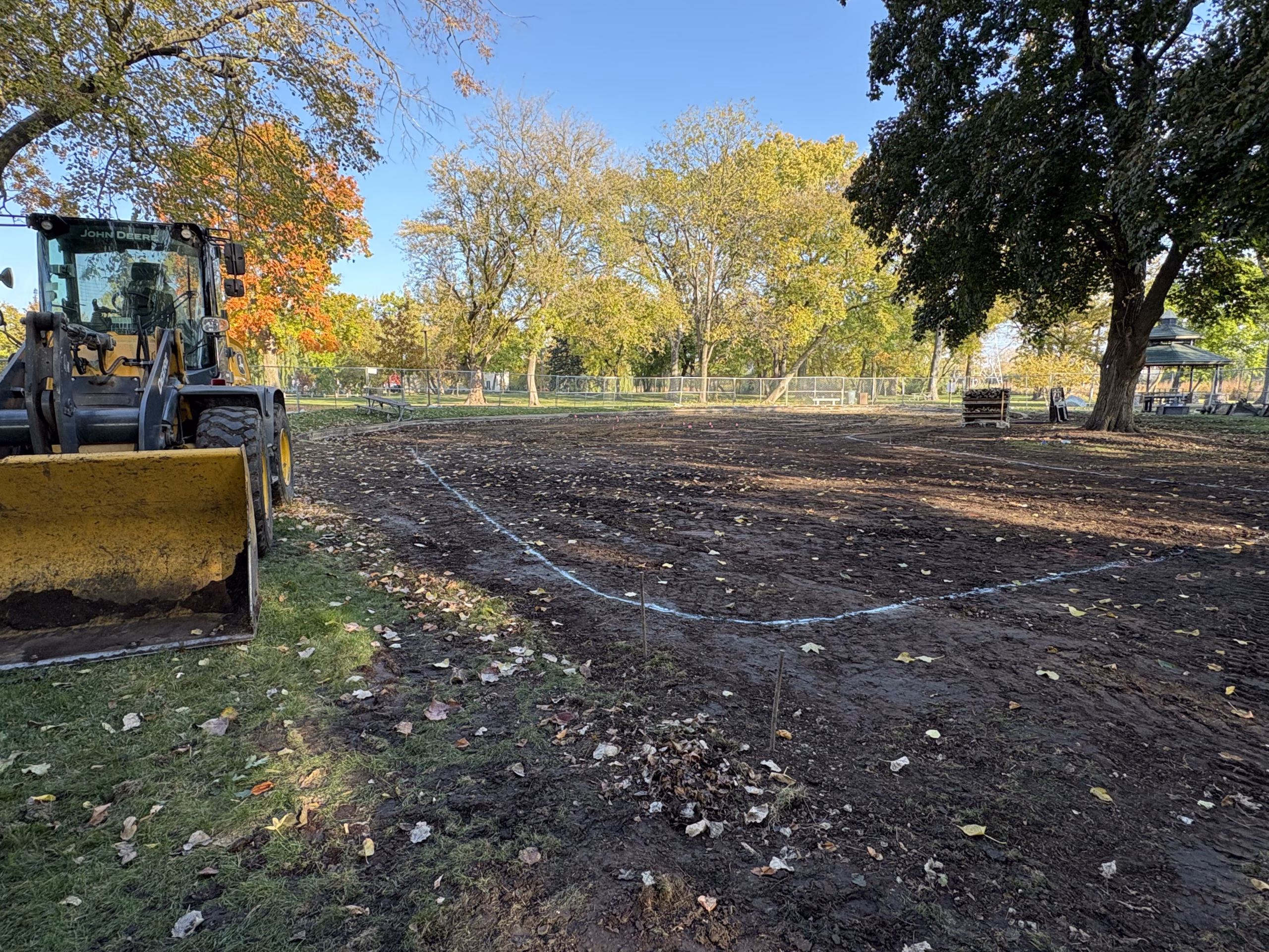 Site preparation is progressing at Denoyer Park. The play area has been graded and marked for installation, and crews have begun outlining the locations for the new playground features. Heavy equipment remains on site as groundwork continues ahead of surfacing and structure installation in the coming weeks.