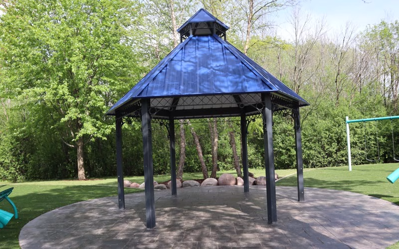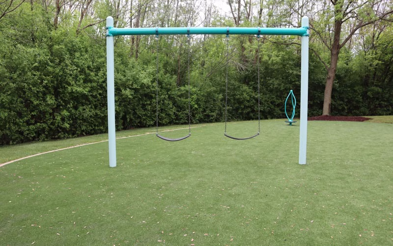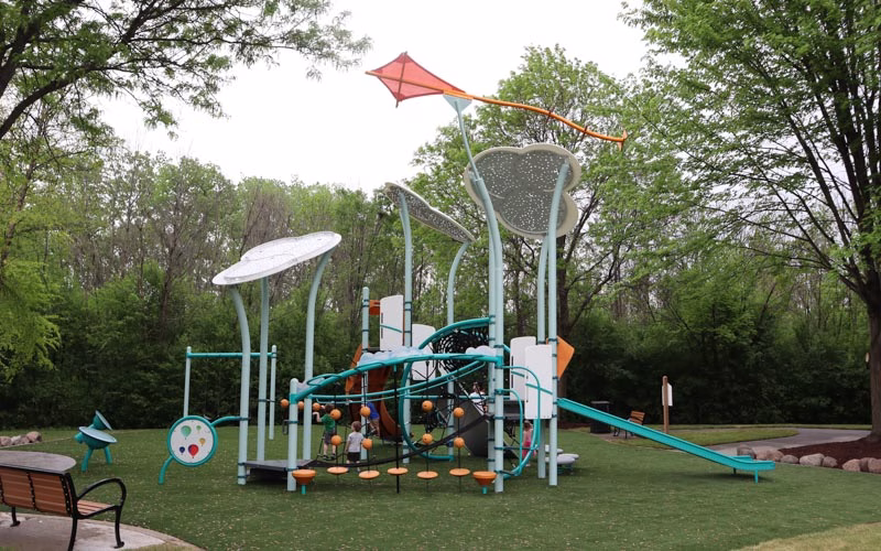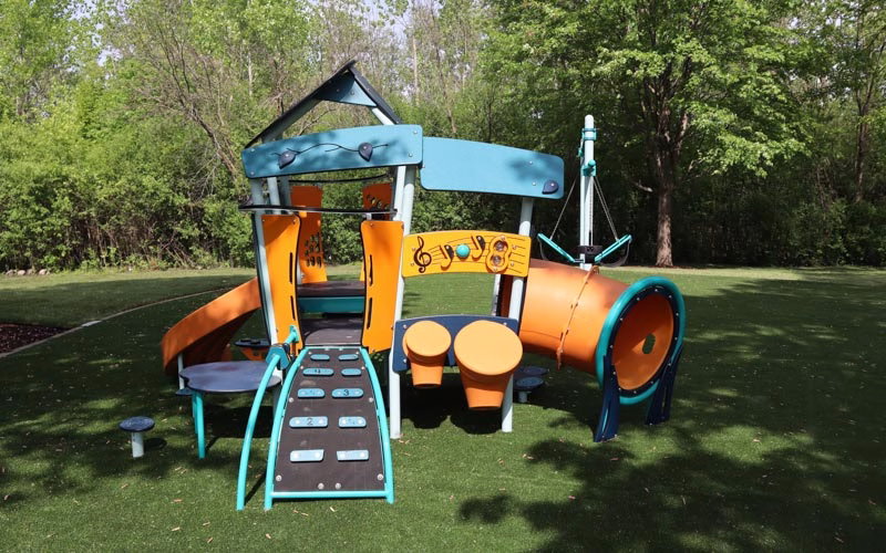 The new playground design, for ages five through 12, features bright, colorful play pieces, synthetic safety surfaces and whimsical shade structures. The area, designated for ages two to five, has a variety of unique equipment including balance steppers, music makers, numbers climber, inclined tunnel, and curved slide. A toddler swing and friendship swing are located adjacent to, at a safe distance from, the active play area. The section, for five- to 12-year-olds, includes additional music makers (kettle and goblet drums), climbing apparatus (belt bridge, star seeker, belt hammock, vertical ladder, overhead ladder with swiggle-knot bridge and spiral, pod, flex and mobius climbers), grab bar, swings, wobble pods, roller and alpine slides and spinners (saddle and curva).