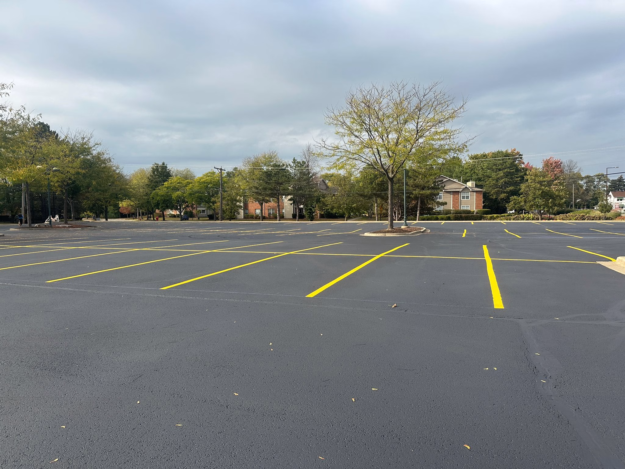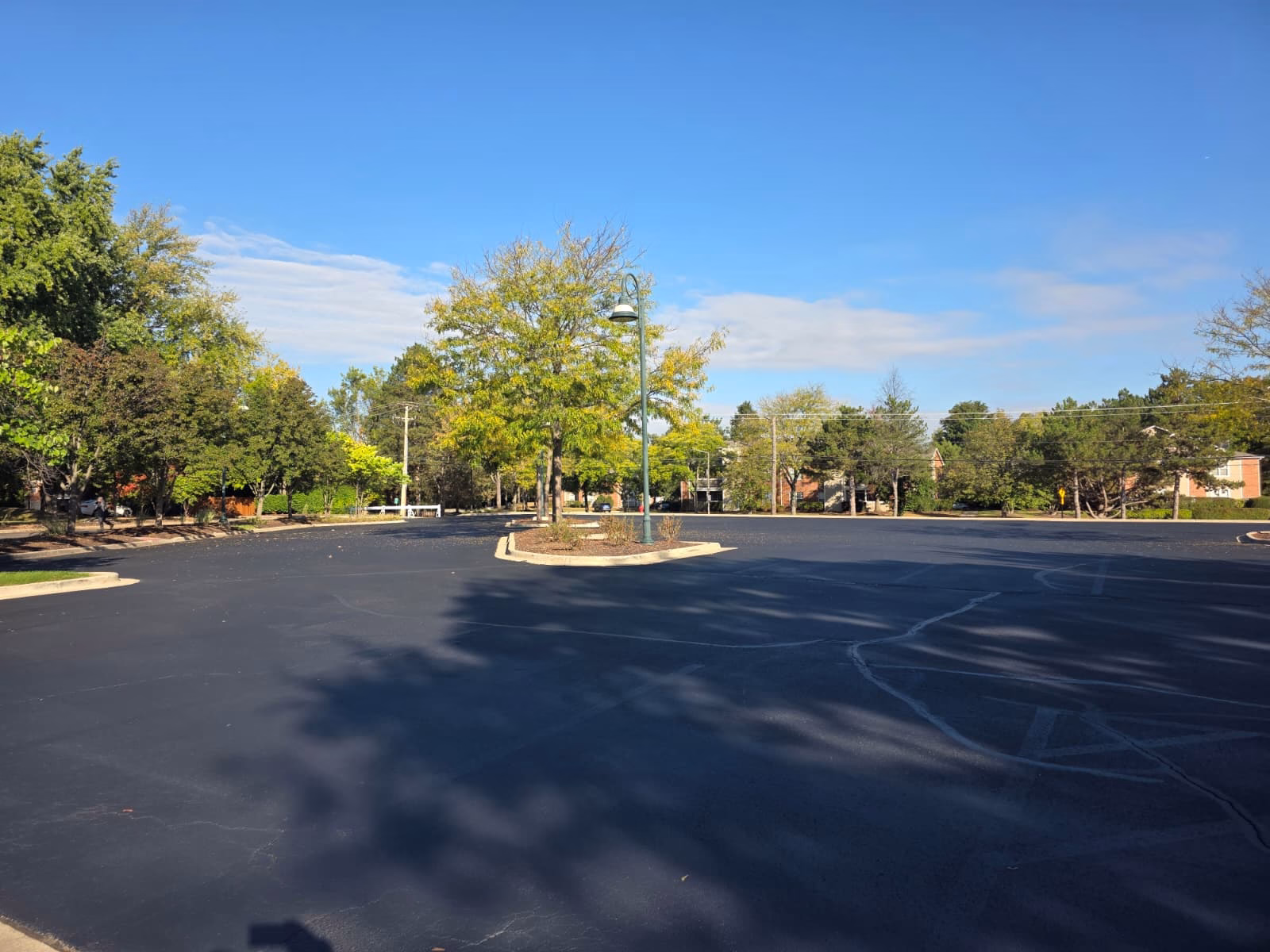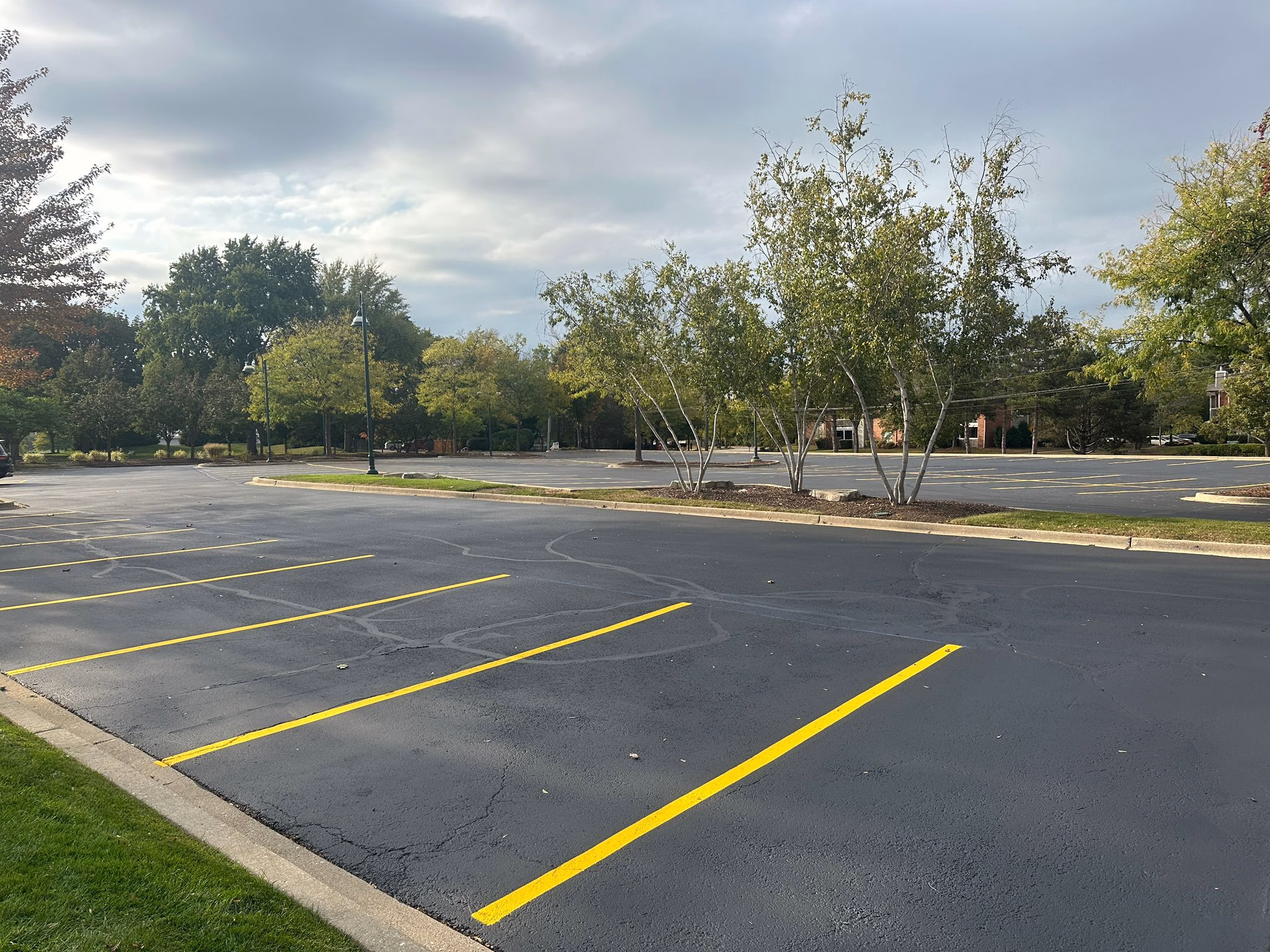 Fresh striping has been completed on the newly sealcoated north side of the Chevy Chase Country Club parking lot, marking clear and vibrant parking lines.